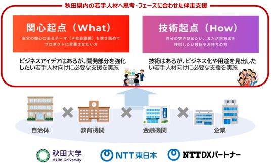国立大学法人秋田大学(学長:南谷佳弘、以下「秋田大学」)、NTT東日本株式会社秋田支店(支店長:澤村誉、以下「NTT東日本 秋田支店」)、株式会社NTT DXパートナー(代表取締役社長:阿部隆、以下「NTT DXパートナー」)は、経済産業省令和6年度「未踏的な地方の若手人材発掘育成支援事業費補助金(AKATSUKIプロジェクト)※1」に採択され、教育機関・自治体・金融機関・県内外企業・支援者のコンソーシアムによる、秋田県内在住で熱意のある、独創的なアイデア・技術を有する若手人材を支援するイノベーション・プログラム「ASHIOTO -足音-」を企画・運営しています。