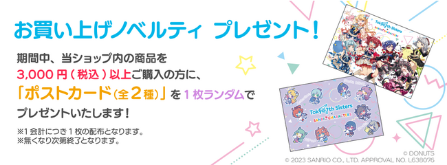 POP UP SHOPでは「EPISODE 2053」に登場するアイドルたちとサンリオキャラクターズがコラボレーションした描き下ろしグッズを販売いたします。期間中に開催店舗にて税込3,000円以上ご購入の方にはお買い上げノベルティとして、2種類の絵柄のポストカードからランダムで1枚プレゼントいたします。