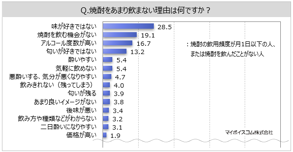 焼酎の飲用頻度が月1日以下の人、焼酎を飲んだことがない人に、あまり飲まない理由を聞きました(複数回答)。「味が好きではない」が28.5%、「焼酎を飲む機会がない」「アルコール度数が高い」「匂いが好きではない」が各10%台です。「味が好きではない」は、女性で比率が高くなっています。