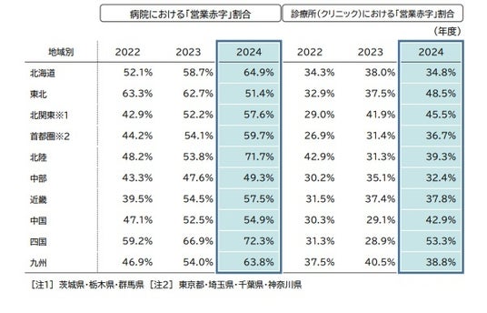 地域別にみると(病院本部の所在地)、2024年度の病院経営で最も営業赤字の割合が高いのは「四国」(72.3%)で、全体の7割を占めた。次いで「北陸」(71.7%)、「北海道」(64.9%)、「九州」(63.8%)と続いた。最も低いのは「中部」(49.3%)で、5割を下回る水準だった。