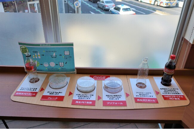飲み終えたペットボトルがリサイクルされる様子を展示