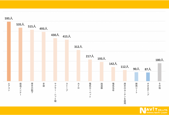 このアンケートは複数回答にていただいています。1番多かった回答は「エアコン」で595名となっています。次に多かったのが最近人気の機能性インナーである「保湿インナー」で535名です。3番目に多かったのは「厚手の靴下」で515名となっています。