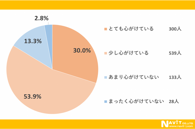 電気代などの高騰が激しい昨今です。節電に対する意識はどのようになっているのでしょうか。寒さ対策で節電を「とても心がけている」という方が30.0%となっています。そして「少し心がけている」という方が53.9%となっており、合計すると83.9%の方が節電を意識しているという結果になりました。