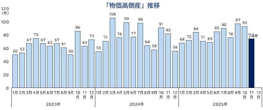 ■ 「物価高倒産」は74件判明し、2025年1-11月の累計は879件となった
