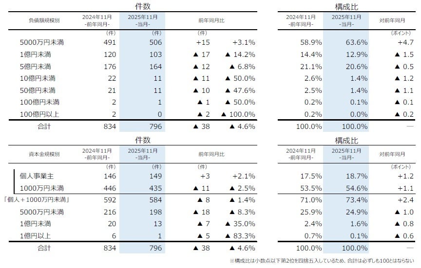 資本金を規模別にみると、『個人+1000万円未満』の倒産が584件(前年同月592件、1.4%減)となり、11月としては前年に次ぎ2000年以降で2番目に多かった。