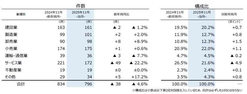 業種別にみると、7業種中3業種で前年を下回った。『小売業』(前年同期174件→175件、0.6%増)が最も多く、全体の22.0%を占めた。業種別トップとなるのは約4年ぶり。一方、『サービス業』(同221件→172件、22.2%減)は3カ月ぶりに前年を下回った。減少率が20%を上回ったのは2021年8月以来約4年ぶり。