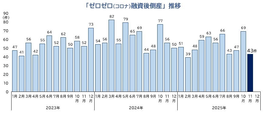 「ゼロゼロ(コロナ)融資後倒産」は、43件(前年同月56件、23.2%減)判明し、7カ月連続で前年を下回った。業種別にみると、『小売業』が14件で最も多く、『製造業』が10件、『建設業』『卸売業』が各7件で続いた。2025年1-11月の累計は584件となり、前年同期(685件)を14.7%下回るペースで推移している。