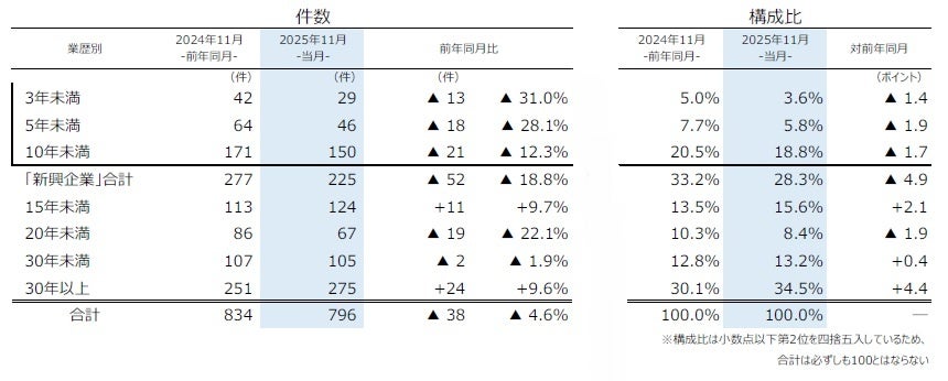 業歴別にみると、「30年以上」が最多の275件(前年同月251件、9.6%増)と3カ月連続で前年を上回り、全体の34.5%を占めた。このうち、老舗企業(業歴100年以上)の倒産は16件(同10件、60.0%増)だった。