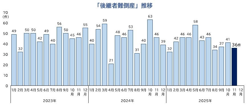 「後継者難倒産」は、36件(前年同月46件、21.7%減)判明し、3カ月連続で前年を下回った。業種別にみると、『卸売業』が9件で最も多く、『建設業』『サービス業』が各7件、『製造業』が5件で続いた。2025年1-11月の累計は461件となり、前年同期(501件)を8.0%下回った。