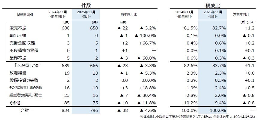主因別にみると、「販売不振」が658件(前年同月680件、3.2%減)で、3カ月ぶりに前年を下回った。「業界不振」(前年同月5件→2件、60.0%減)は2カ月連続で前年を下回った。このほか、「売掛金回収難」(同3件→5件、66.7%増)などを含めた『不況型倒産』は666件(同689件、3.3%減)となり、全体の83.7%を占めた。2025年1-11月の累計は7792件で前年同期(7493件)を上回った。