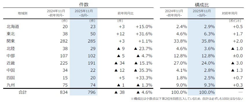 地域別にみると、9地域中5地域で前年を下回った。『近畿』(前年同月225件→191件、15.1%減)は3カ月ぶりに前年を下回った。特に「大阪」(同123件→81件)の減少が目立った。一方、『関東』(同282件→285件、1.1%増)は6カ月連続で前年を上回り、11月としては過去10年で最多となった。