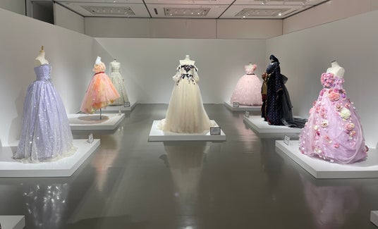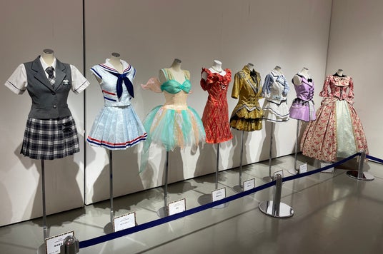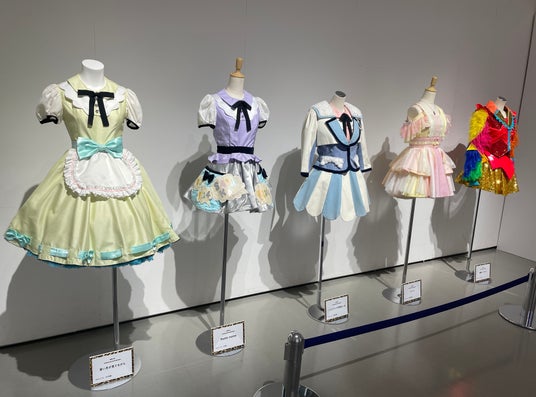 CDジャケットやライブの衣装はもちろん、「ここにだって天使はいる」公演や卒業ドレスまで、約100着を展示。