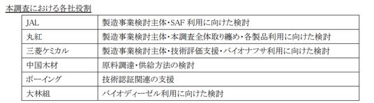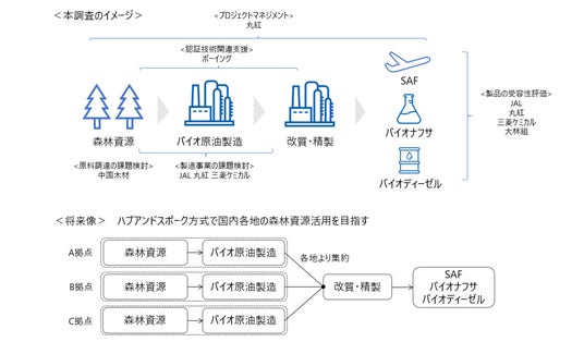 日本航空株式会社(以下、「JAL」)、丸紅株式会社(以下、「丸紅」)、三菱ケミカル株式会社(以下、「三菱ケミカル」)、中国木材株式会社(以下、「中国木材」)、ボーイングジャパン株式会社(以下、「ボーイング」)、株式会社大林組(以下、「大林組」)の6社は、国内の森林資源から持続可能な航空燃料(Sustainable Aviation Fuel、以下、「SAF」)、バイオナフサ、バイオディーゼルを製造・販売する事業についての事業性調査(以下、「本調査」)を目的とした覚書を締結しました。