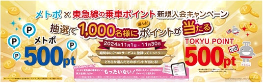 東京地下鉄株式会社(本社:東京都台東区、代表取締役社長:山村 明義、以下「東京メトロ」)と、東急電鉄株式会社(本社:東京都渋谷区、取締役社長:福田 誠一、以下「東急電鉄」)は、両社の乗車ポイントサービスであるメトロポイントクラブ(以下「メトポ」)と「電車とバスで貯まるTOKYU POINT」(以下「東急線の乗車ポイント」)の新規入会キャンペーン(以下「本キャンペーン」)を、2024年11月1日(金)~2024年11月30日(土)に共同で実施します。