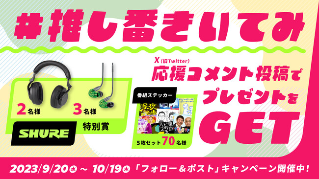 各番組ファンのアツイ「推し番の魅力」を、まだ聴いたことのない周りの方や番組出演者やスタッフへ向けて、X(旧Twitter)で語って届けてください。「推したい番組名の公式ハッシュタグ」とキャンペーン指定ハッシュタグ「#推し番きいてみ」を必ずつけて、アナタがどうしてその番組が好きなのか?おすすめ神回など応援コメント投稿でキャンペーンに参加となります。