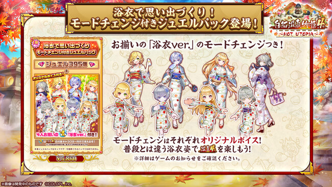 今回は「プレミアムジュエルパック」「ジュエルパックLite」に加えて、キャラガチャに登場する4人の「浴衣姿ver.」のモードチェンジを解放することができる「モードチェンジ付きジュエルパック 」を販売しております。キャラクターの「浴衣姿ver.」は、キャラガチャで対象のキャラを仲間にしていると解放することができます。
