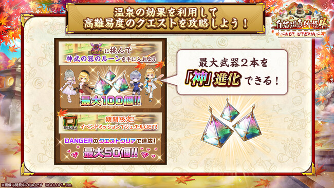 本イベントのストーリーはキャラクターたちが「秘湯の島ユートピア」にてさまざまな温泉を巡る内容となっており、クエストでもストーリーを再現したさまざまな温泉が登場いたします。