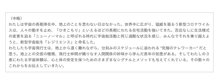 本書では、野口さんが経験した民間宇宙船や国際宇宙ステーションの最新状況、そして乗り越えるまでに苦労した「燃え尽き症候群」も告白。コロナ時代の新しい生活様式で求められるコミュニケーション術や、心と体の安定を保つ方法など、宇宙好きにはもちろんのこと、現代のビジネスマンにも役立つ一冊です。