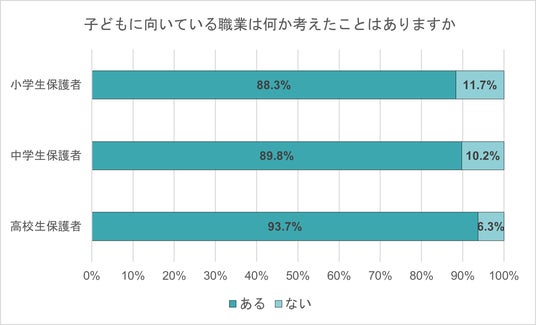 小学1年生~高校3年生の子どもをもつ保護者に、子どもに向いている職業は何か考えたことがあるかを聞いたところ、小学生保護者の88.3%、中学生保護者の89.8%、高校生保護者の93.7%が「ある」と回答した。