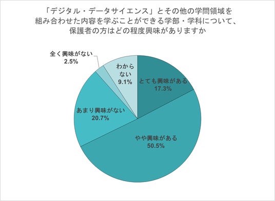 文部科学省は、理系・デジタル人材の育成を目的に大学の理系学部の新設を推進しており、スポーツ、芸術、経営、農業など、「デジタル・データサイエンス」とその他の学問領域を組み合わせた内容を学ぶことができる学部・学科も新設が予定されている。そのような学部・学科について、保護者がどの程度興味があるかを聞いたところ、「とても興味がある」「やや興味がある」と回答した保護者があわせて7割弱となった。