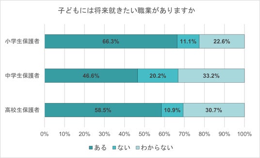 保護者に、子どもには将来就きたい職業があるか聞いたところ、小学生保護者の66.3%、中学生保護者の46.6%、高校生保護者の58.5%が「ある」と回答した。