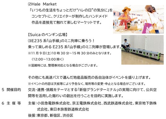 小田急電鉄株式会社、京王電鉄株式会社、西武鉄道株式会社、東京地下鉄株式会社、東日本旅客鉄道株式会社が共同して、2024年11月8日(金)、9日(土)に、甲州街道(バスタ新宿前)歩道・Suicaのペンギン広場にて、公共空間等を活用した賑わいの創出を目指す「SHINJUKU MIX STREET 2024」を開催します。