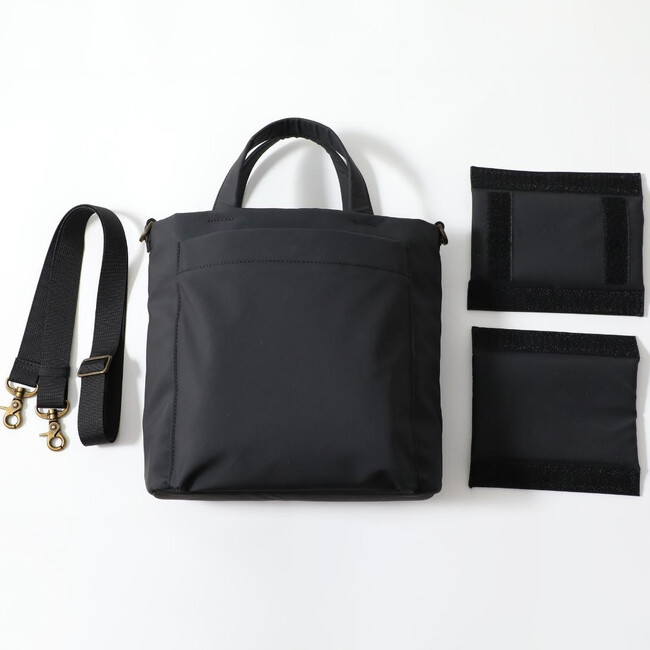 マットブラックとオフホワイトという使いやすい2色展開で、それぞれ真鍮カラーの留め具を施し、お散歩バッグには見えないスタイリッシュなデザインにしました。