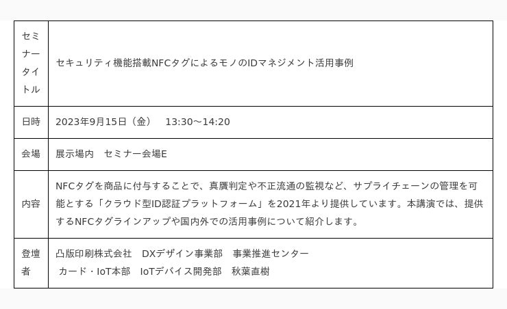 出展社によるセミナーでは、「セキュリティ機能搭載NFCタグによるモノのIDマネジメント活用事例」を紹介します。