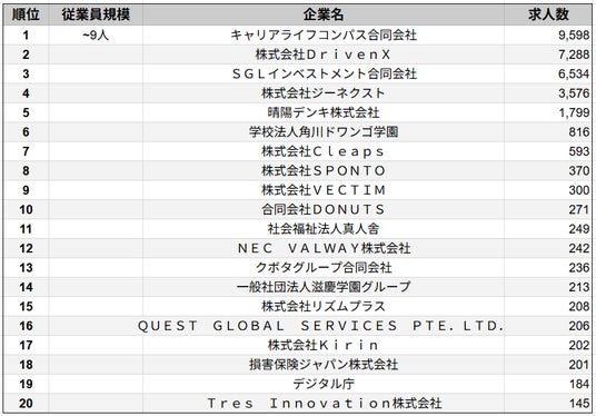 株式会社SalesNow(本社:東京都渋谷区、代表取締役:村岡功規、以下「当社」)は、国内540万社の企業情報を完全網羅した日本最大級のデータベース「SalesNow DB」より、2024年4月1日~2025年4月1日の期間における求人データ(※アルバイト媒体を除く)をもとに、「従業員数9人以下」の企業における求人数ランキングTOP20を集計・発表いたしました。