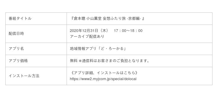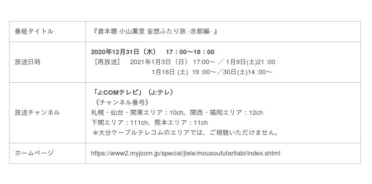 株式会社ジュピターテレコム(本社:東京都千代田区、代表取締役社長:石川 雄三、以下J:COM)は、倉本聰さんと小山薫堂さん出演の紀行ドキュメンタリー『妄想ふたり旅-京都編-』を制作し、2020年12月31日(木)17時よりJ:COMのコミュニティチャンネル「J:テレ」(J:COM テレビ)で放送いたします。さらに、J:COM が提供する地域情報アプリ「ど・ろーかる」で配信*1を行いますので、スマートフォンやタブレットで外出先など、全国どこでもご視聴いただけます。