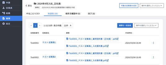 「書類」画面で作成した書類を従業員にメールで送信することで、電子締結を行うことが可能です。