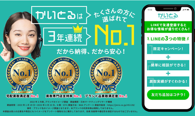 日本マーケティングリサーチ機構が、2022年2月に買取専門店においてインターネット調査を実施した結果、グッドリユース株式会社が運営する「かいとる」が、『宅配買取満足度 No.1』『買取専門店支持率 No.1』『ブランド品買取満足度 No.1』を3年連続で獲得しました。
