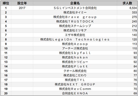 株式会社SalesNow(本社:東京都渋谷区、代表取締役:村岡功規、以下「当社」)は、国内540万社の企業情報を完全網羅した日本最大級のデータベース「SalesNow DB」より、2024年4月1日~2025年4月1日の期間における求人データ(※アルバイト媒体を除く)をもとに、「2017年設立企業」における求人数ランキングTOP20を集計・発表いたしました。