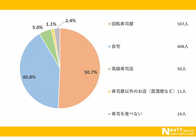 普段お寿司を食べる場所については、「回転寿司屋」が50.7%、「自宅」が40.8%、「高級寿司店」が5.0%という順になりました。