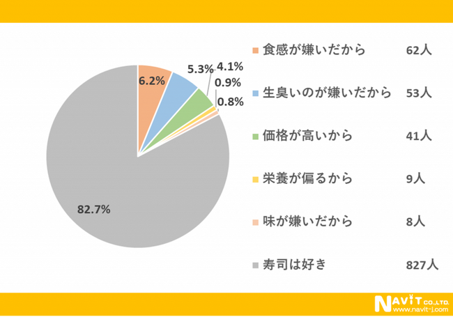 反対に、「お寿司が嫌いな1番の理由は次のうちどれですか?」という質問を行ったところ、「食感が嫌いだから」が6.2%、「生臭いのが嫌いだから」が5.3%、「価格が高いから」が4.1%という順になりました。