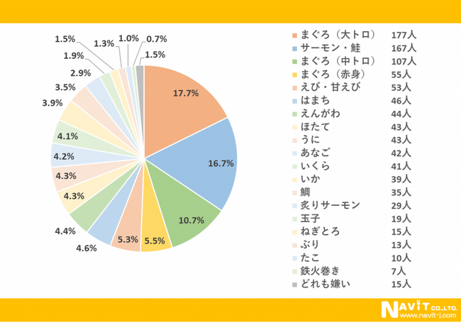 寿司の中で一番好きなネタは「まぐろ(大トロ)」が最多