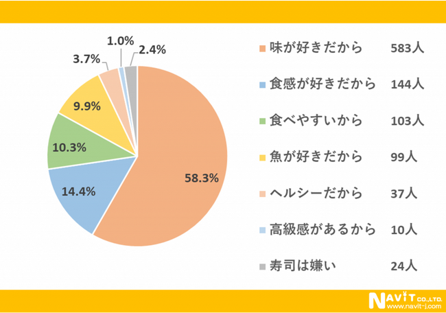 「お寿司が好きな1番の理由は次のうちどれですか?」という質問については、「味が好きだから」が58.3%、「触感が好きだから」が14.4%、「食べやすいから」が10.3%という順になりました。