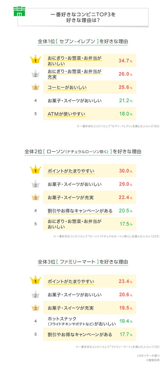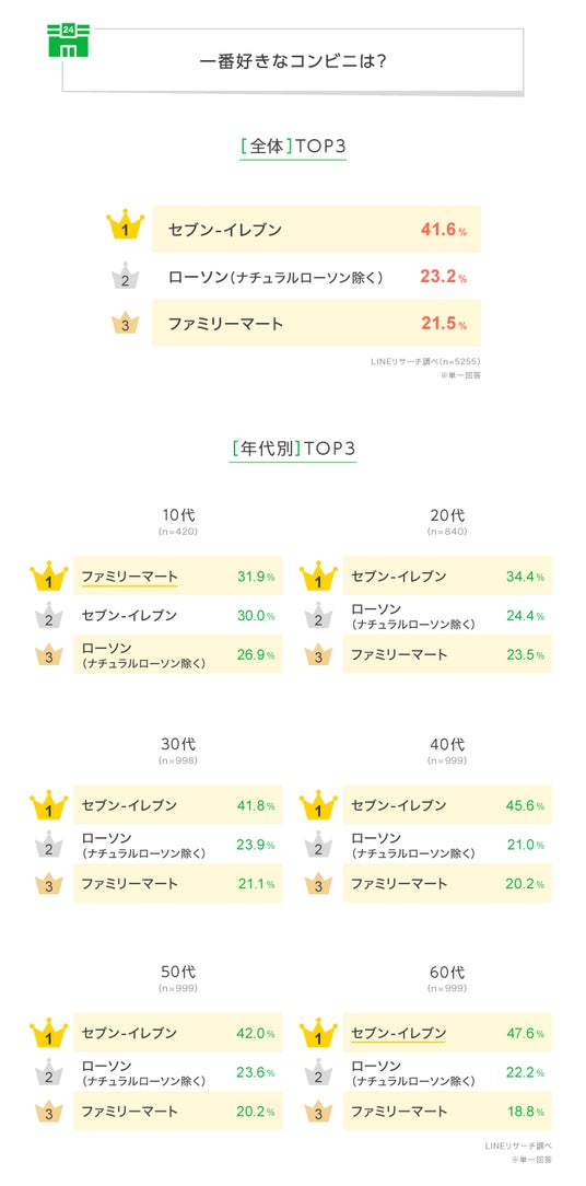 LINEリサーチ、全国の10~60代の男女を対象に、一番好きなコンビニや、そのコンビニを好きな理由に関する調査を実施