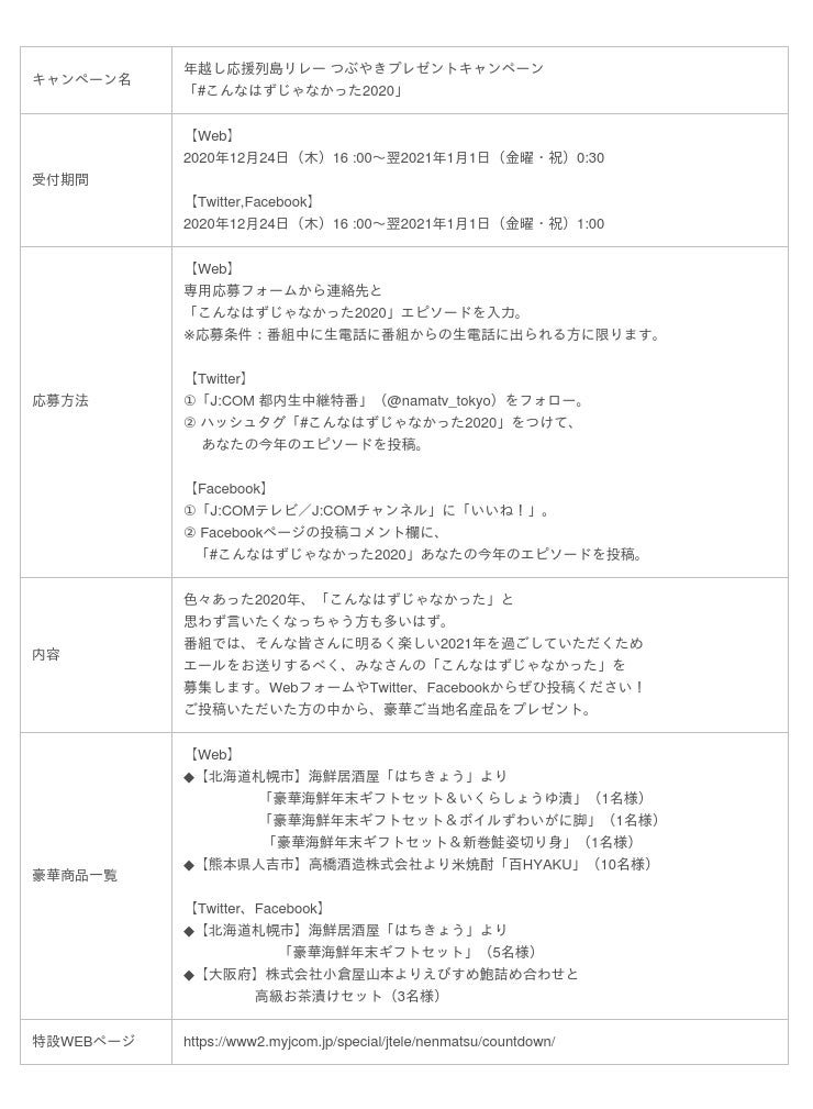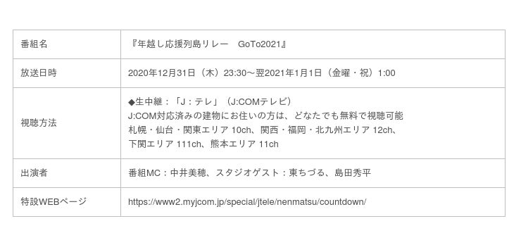 株式会社ジュピターテレコム(J:COM、本社:東京都千代田区、代表取締役社長:石川 雄三)は、年越し特番として、2020年12月31日(木)23時30分から翌2021年1月1日(金・祝)1時にかけて日本全国への“応援”をテーマにした『年越し応援列島リレー GoTo2021』をJ:COMのコミュニティチャンネル「J:テレ」(J:COMテレビ)で放送し、地域情報アプリ「ど・ろーかる」でも配信します。年越し特番の実施は、今年で5年目を迎えます。