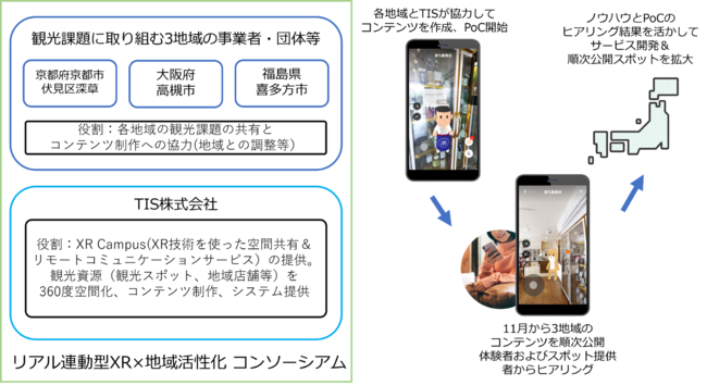 今回、コンソーシアムに参加する伏見深草、喜多方、高槻の3地域は、認知度はあるものの特定のスポットに観光客が偏っており、複数ある観光資源が知られていないといった課題があります。3地域の魅力向上や活性化へ向けて、TISは「XR Campus」を活用したバーチャル来訪体験による地域活性化を企図し、各地域の事業者を中心とした地域の有志の方々とコンソーシアムを設立し、共同でこれらの課題解決に取り組むことになりました。