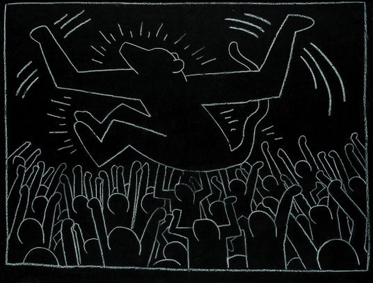 1980年、人々の日常の一部として見てもらうことのできる場所として、ニューヨークの地下鉄駅構内の空いた広告板に貼られた黒い紙にチョークで描く「サブウェイ・ドローイング」を開始。公共施設へのグラフィティは違法行為のため、警官に捕まらないよう素早く描き、地下鉄に飛び乗って次の駅へと向かいました。コミカルで人々の思考や想像力を刺激するイメージは、瞬く間にニューヨーカーを魅了。有名になるにつれてドローイングは剥がされ、売買されるようになったため、1986年にこのプロジェクトは中止されました。猿のような動物が大勢の人びとに持ち上げられている本作のように社会風刺的な作品や、新年の挨拶のようなコミュケーションツールとしての作品も制作されました。