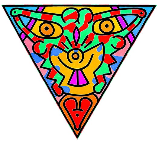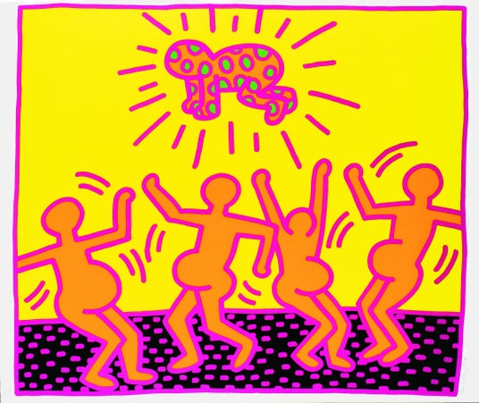 フランシス・ベーコンやジャン=ミシェル・バスキアの展覧会を手がけた80年代のソーホーの大手画廊、トニー・シャフラジ・ギャラリーより1983年に出版された版画シリーズ。本作には蛍光インクが使われており、ブラックライトにより光を放ちます。この作品シリーズには、ピラミッドやアンクの十字架など生命のシンボルが描かれ、光り輝く妊婦やダンスの動きが盛り込まれることで、母親たちの強さを讃えているといえるでしょう。身体の動きを表現する線(アクションライン)が効果的に使われています。