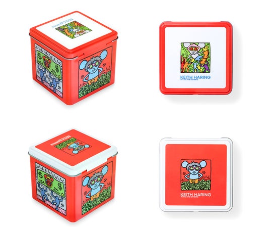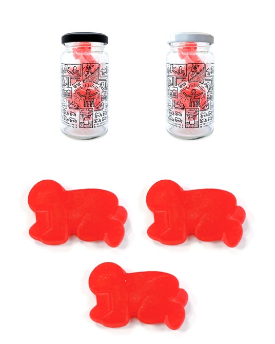 全2種。《ブループリント・ドローイング》の絵柄をあしらった手のひらサイズのガラスビン。中にはラディアント・ベイビーの形をしたチェリー風味のグミがはいっています。