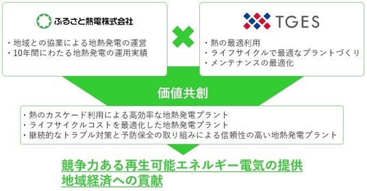 ふるさと熱電株式会社(社長:赤石 和幸、以下「ふるさと熱電」)と東京ガスエンジニアリングソリューションズ株式会社(社長:小西 康弘、以下「TGES」)は、地熱発電事業の競争力強化に向け、地熱発電プラントの最適化に係る協業(以下「本協業」)の覚書を本日締結しました。