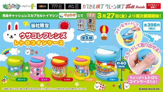 株式会社イオンファンタジー(本社:千葉県千葉市、代表取締役社長:藤原徳也、以下、当社)は、株式会社マインドウェイブ(本社:大阪府大阪市、代表取締役:宮内俊治)のキャラクター『ウサコレフレンズ』の限定カプセルトイ用商品を、アミューズメント施設「モーリーファンタジー」「PALO」、カプセルトイ専門店「TOYS SPOT PALO」「カプセル横丁」などに設置する当社オリジナル完全キャッシュレスカプセルトイマシン「かぷえぼ」で3月27日(金)より順次展開いたします。