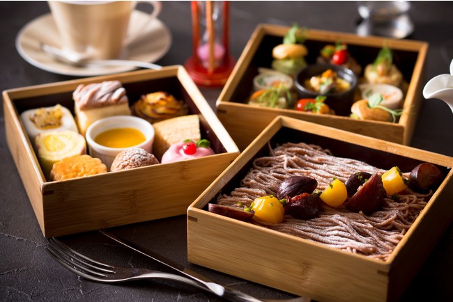京都の竹芸品メーカー「公長齋小菅(こうちょうさいこすが)」の竹のお重箱に入った「オータムアフタヌーンティーセット」は、秋ならではのスイーツ9種を用意。さつまいものロールケーキやかぼちゃプリンなど、毎年人気の秋の味覚が愉しめるアフタヌーンティーセットです。さらに今年は、三の重に「くりの重」をオプションで追加でき、お重一面に敷き詰めたモンブランを堪能できます。栗の甘露煮が並べられ、秋ならではの“栗”を思いっきり味わうことができます。