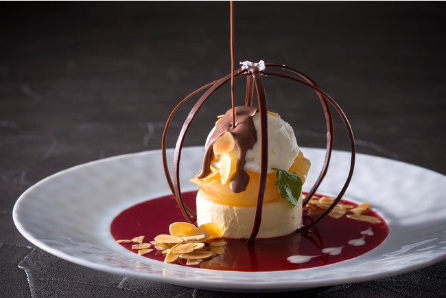 洋梨のムースの上に旬を迎える洋梨のコンポート、バニラアイスクリームが乗り、細いチョコレートのアーチで覆われています。食べる直前に、温かいチョコレートソースをお客様自身でかけていただくデザートです。冷たいバニラアイスクリームが溶け、ラズベリーソースとのマリアージュが愉しめます。柔らかくなるまで丁寧に煮込んだ洋梨のコンポートとともにアーモンドスライスの食感の違いも愉しい大人なデザートです。