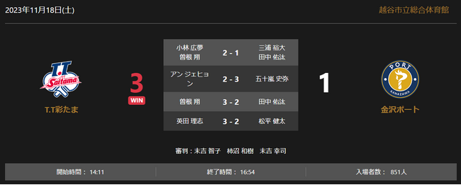 2023-11-19 一般社団法人Tリーグ ノジマTリーグ 2023-2024シーズン 公式戦 11月18日開催 T.T彩たまvs金沢ポート試合結果 Tweet T.T彩たまと金沢ポートの試合は、3-1でT.T彩たまが勝利しました。 企業プレスリリース詳細へ PR TIMESトップへ 公式ツイッター Follow @Straightpress 最新情報をTwitterで受け取ろう! 公式フェイスブックページ 最新情報をFacebookで受け取ろう! 前の記事 一覧へ戻る 次の記事