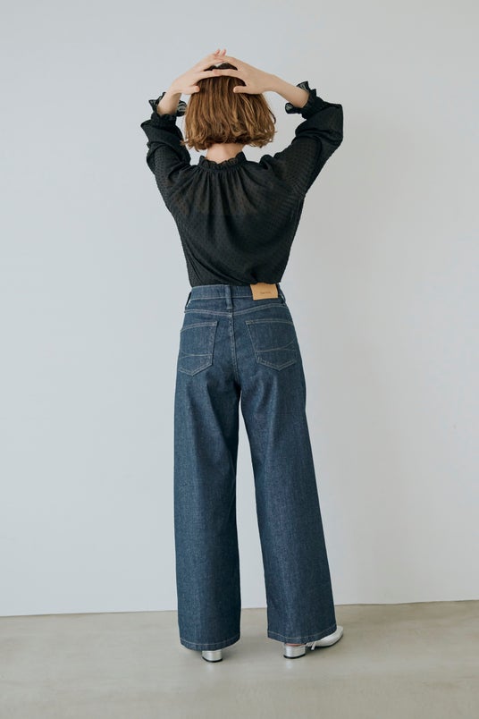 緩やかに広がるフレアシルエットが、レッグラインをカバーしながら脚長に見せてくれ、高めに配置したバックポケットはヒップトップを高く見せてくれるので、スタイルアップ効果も期待できます。