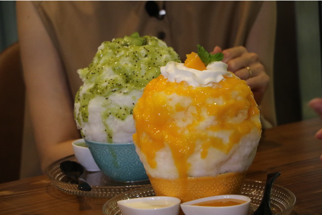 南アルプス八ヶ岳の湧水を凍らせた天然氷に、全国のフルーツを毎朝潰して作る手作りのソースをかけたかき氷を味わいます。
